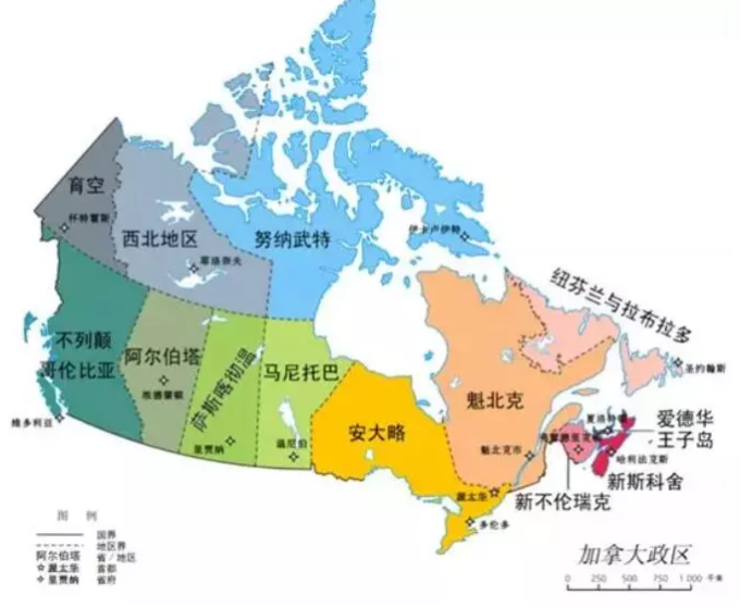 加拿大有阿尔伯塔省、不列颠哥伦比亚省、曼尼托巴省、纽芬兰与拉布拉多省、新不伦瑞克省、新斯科舍省、安大略省、爱德华王子岛省、魁北克省和萨斯喀彻温省10个省,再加上努纳武特地区、西北地区和育空地区3个地区,一共13个行政区。整个国家从南到北由东到西各方面差异都很大,准备的衣服和开销有差就算了,甚至连语言也不一样。就像东北和广东都有一个“东”字,但差别可是大大的呀!