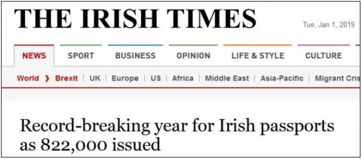 截止到2018年12月31日,英国脱欧让爱尔兰的护照服务创下该国记录,超过19万英国公民2018年申请了爱尔兰护照。其中,来自英格兰、苏格兰、威尔士的护照申请数量98,544份,比2017年增加22%,占爱尔兰2018年护照申请总量的12%;来自北爱尔兰居民的护照申请84,855份,增长了2%。