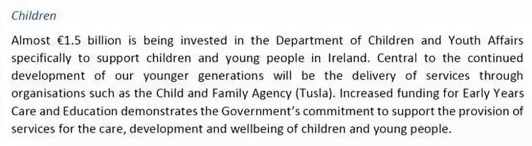 爱尔兰政府计划在2019年拨给儿童和青年事务部15亿欧元旨在支持爱尔兰早期关怀与教育事业。目前,爱尔兰政府推出“可负担保育计划”(ACS),和早期关爱教育计划(ECCE)为6个月-5岁零6个月的适龄婴幼儿及儿童提供幼儿园保育补贴和学前教育的免费教育学时课程。