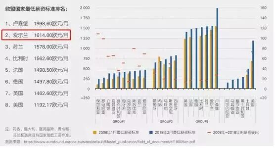 爱尔兰薪资标准在2018年时最低薪资标准已经高达1614欧元/月,位列欧盟第二位!