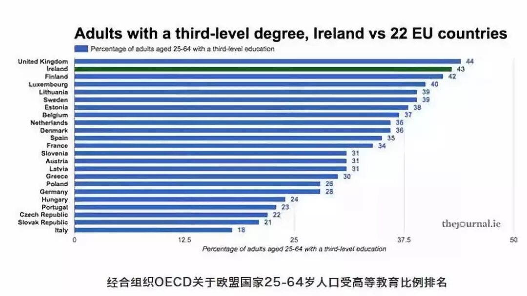 此外,爱尔兰作为世界上接受教育程度最高的国家之一,对教育的投入也是重中之重。爱尔兰拥有受过高等教育的25-64岁人口约占43%,为欧盟中比例最高的国家。