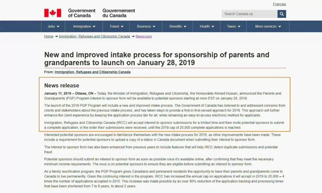 2019年父母/祖父母团聚移民将不再随机抽签,而是先到先得方式(以收到申请人的担保意向表格的时间顺序来发出邀请),2019年父母/祖父母团聚移民的配额为20000个。