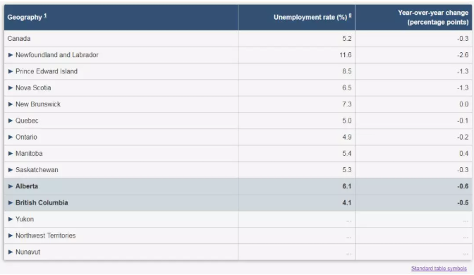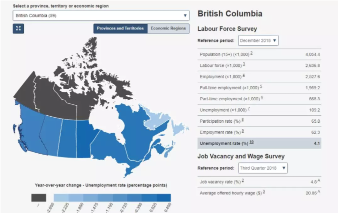 近日,BC省官网公布2018财年第三季度失业率4.1%,全国最低,平均工资 20.85加币/小时,其后紧跟的还有安省、萨省、魁省。