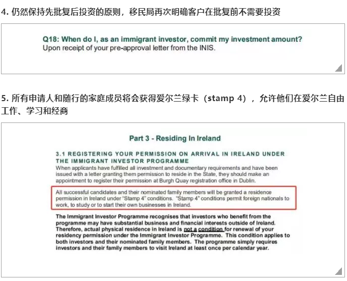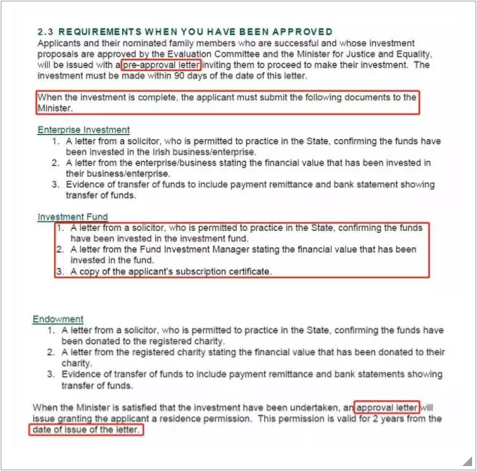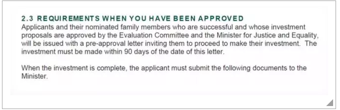 此次法案更新还首次提到了“预批复”环节,即投资人的投资申请由评估委员会(Evaluation Committee)和爱尔兰司法和平等部长( The Minister for Justice and Equality)批准后将获得“预批函”(Pre-approval letter)。